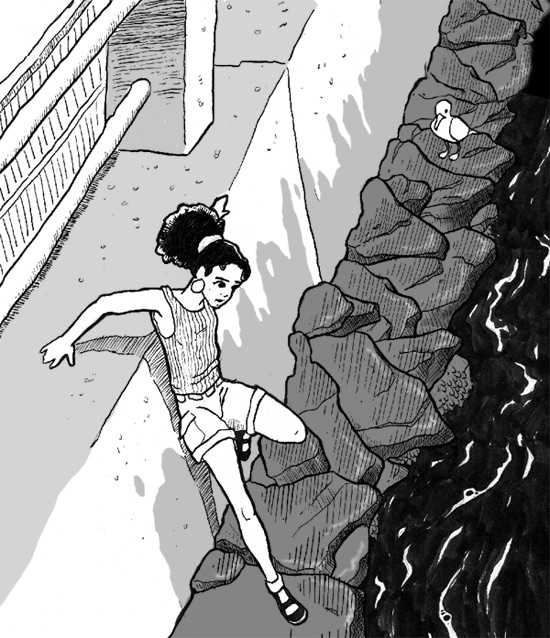 This is a sketch I made yesterday of a shot from one end of the Island near the rocks. I added in the character later. She’s supposed to be skootching down the wall but she kinda looks like she’s just chilling there. I inked this using a Hunts nib#102 and an ink brush for some of the thicker lines and the water (which looks like oil to me)