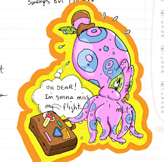 The Daily Doodle May 3, 2009 by wp_admin A stressed out Octopus rushing to make his next flight. Ball point pen. Scanned and colored in Photoshop. Previous articleThe Daily DoodleNext article Fire breathing pastel experiment